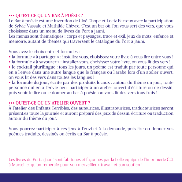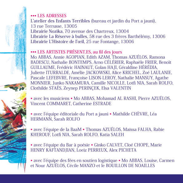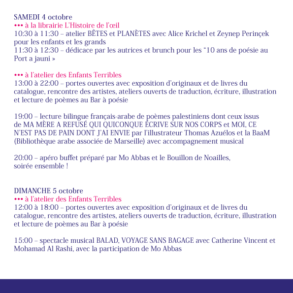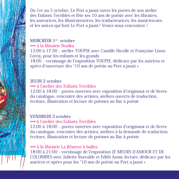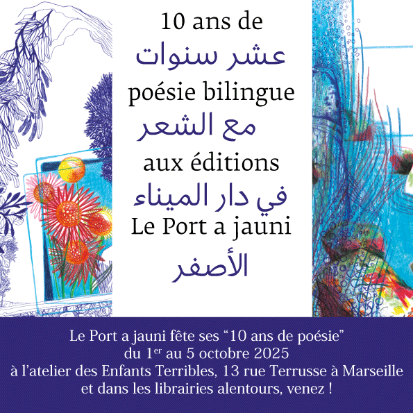 Le Port a jauni fête ses “10 ans de poésie” du 1er au 5 octobre 2025 à l’atelier des Enfants Terribles, 13 rue Terrusse à Marseille et dans les librairies alentours, venez !