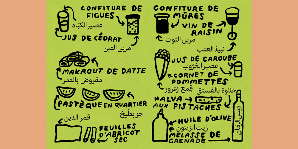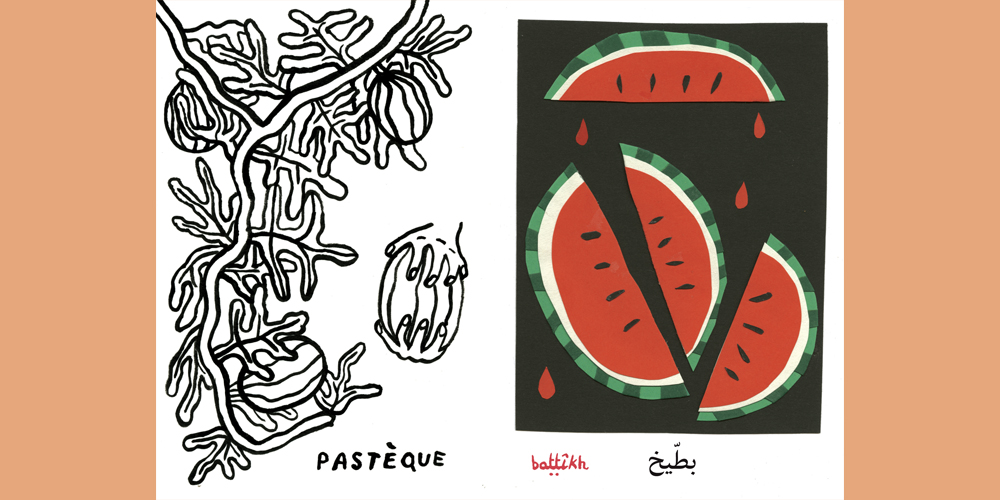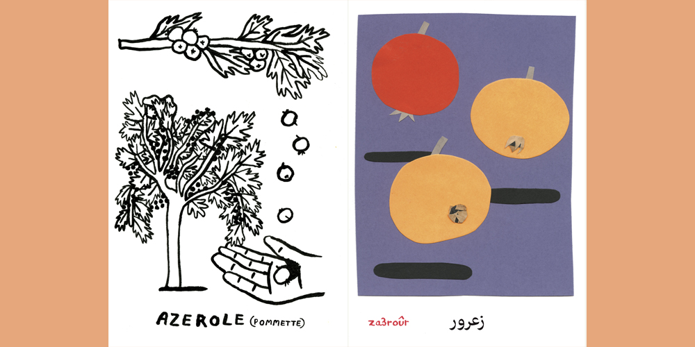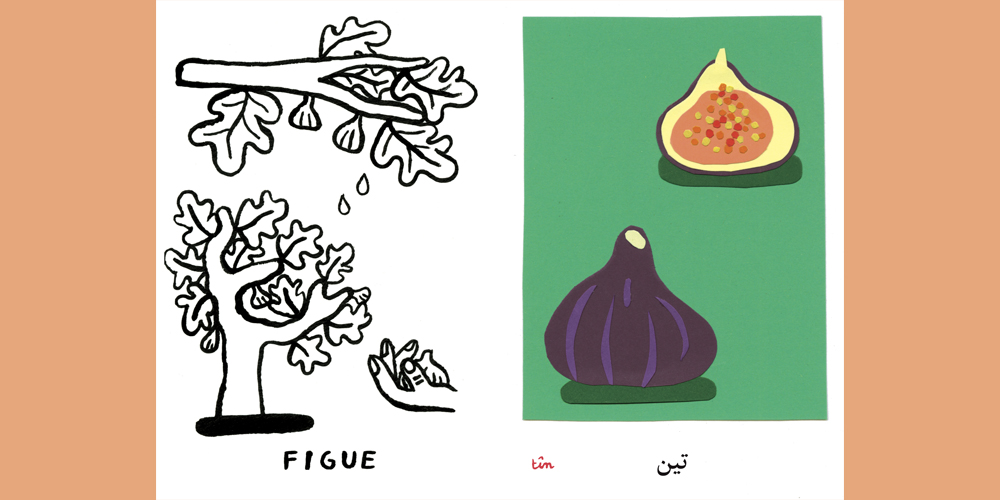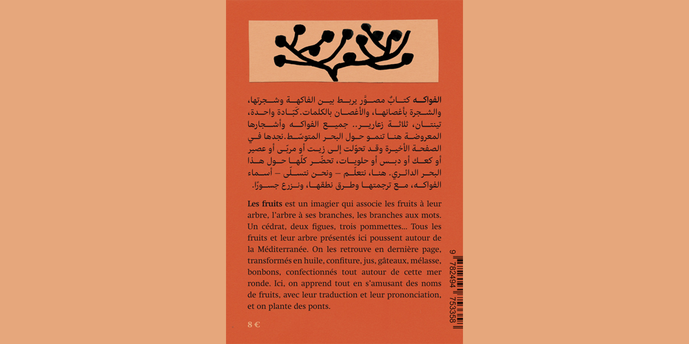 Tous les fruits et leur arbre présentés ici poussent autour de la Méditerranée. « Les racines et les branches des fruitiers ignorent les frontières et forment un cercle autour de la mer. Les fruits relient les terres et plantent des ponts », dit Agathe Monnier. En dernière page, on retrouve les fruits transformés en huile, confiture, jus, gâteaux, mélasse, bonbons, confectionnés tout autour de cette mer ronde. Ici, on apprend le nom de fruits, très courants en arabe, avec leur transcription phonétique et leur traduction en français, tout en s’amusant !